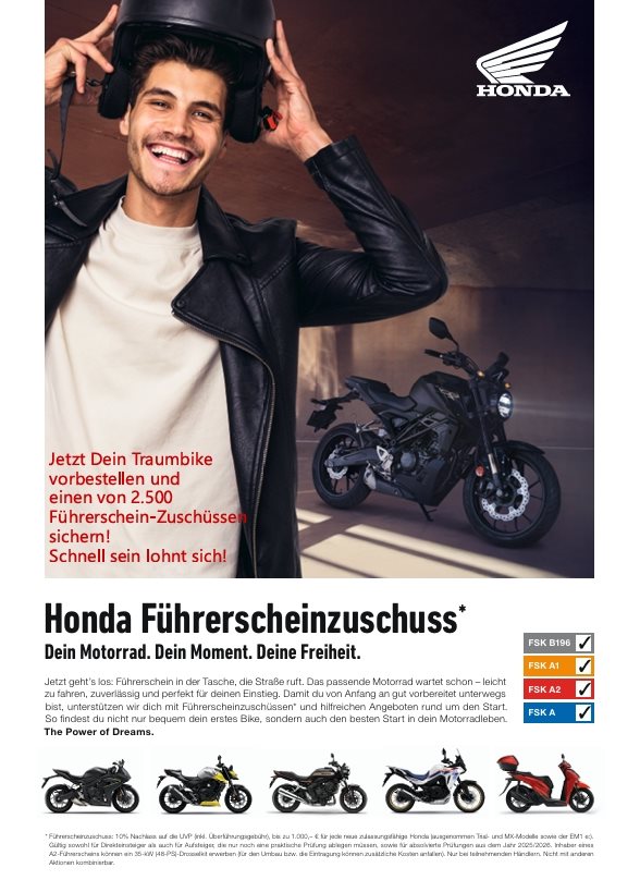 Als Honda Motorradhändler und INDIAN Motorcycle Vertragshändler ist unser Antrieb die Leidenschaft für Leistung. Unser Ziel ist das passende Motorrad für Sie, egal ob neu oder gebraucht. Vom 125er Roller bis zum Tourer.