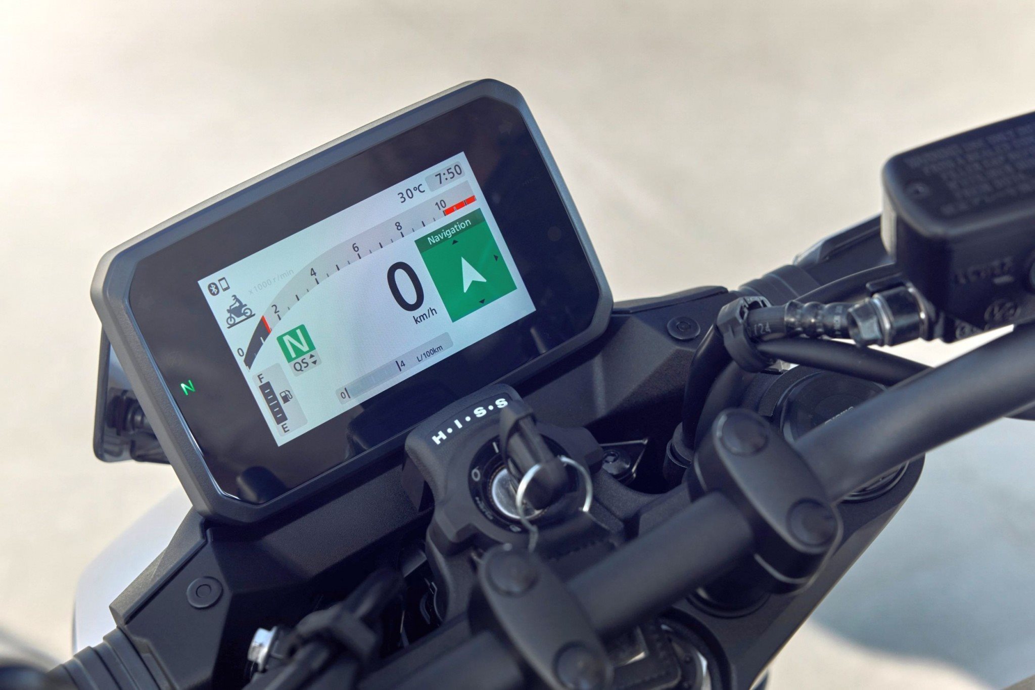 Neues 5 Zoll großes TFT-Farbdisplay integriert RoadSync-Konnektivität, mit Bedienung über Vierwegeschalter an linker Lenkerarmatur